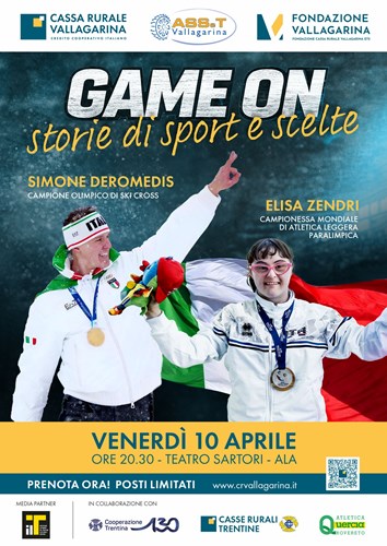 Titolo: “Game On. Storie di sport e di scelte”. Protagonisti (in rigoroso ordine alfabetico): Simone Deromedis, oro olimpico di Ski cross alle recenti Olimpiadi invernali Milano-Cortina, ed Elisa Zendri, campionessa mondiale di atletica leggera paralimpica.