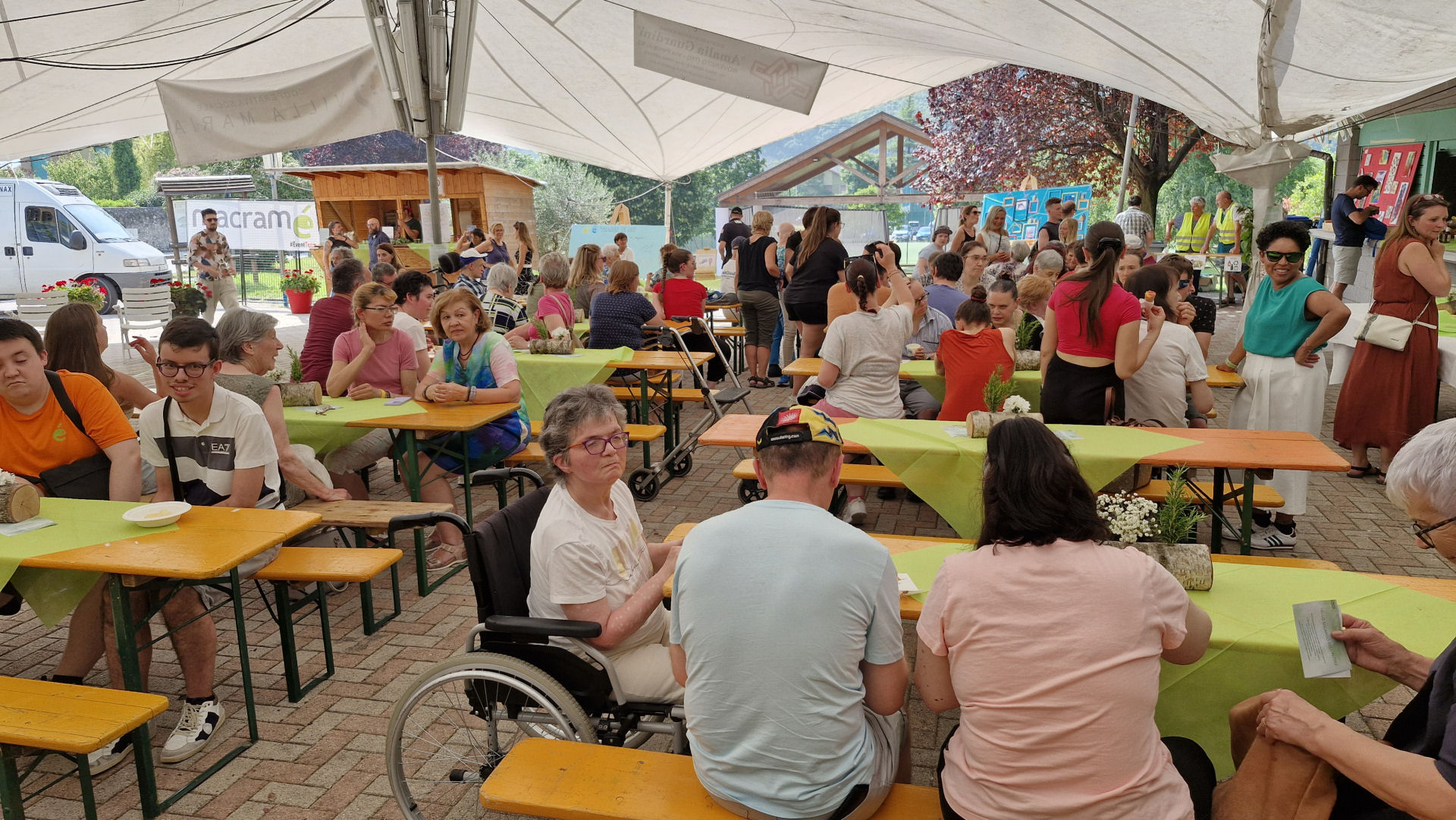 Oltre alla musica e al goloso buffet gestito dalle volontarie dell’associazione Orizzonti, l’evento ha proposto vari momenti coordinati dal Servizio Macramè di Villa Maria. La mostra d’arte intitolata “FluidaMente” ha accolto le opere realizzate dagli utenti delle due coop sociali, in totale 35 persone, che guidati dalla consulente artistica Nadia Ongaro hanno seguito un percorso del fare arte. Interesse e applausi ha suscitato anche la performance “Nello sguardo dell’altro”, nata dalla collaborazione di Villa Maria con la Compagnia Arteviva di Rovereto, interpretata da cinque ospiti della struttura residenziale di Calliano affiancati da tre educatrici. Il cuore del progetto risiede nella valorizzazione dell’individualità e del contributo di ciascuno, nel rispetto dei tempi, dei bisogni e delle fragilità di ogni partecipante. Lo spettacolo ha invitato a riflettere su come il modo in cui guardiamo gli altri (e siamo guardati) possa cambiare radicalmente la percezione di noi stessi e del mondo.