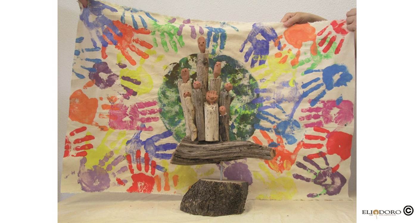 Eliodoro promuove la creatività e le competenze pratico-manuali di ogni persona attraverso attività mirate al lavoro di gruppo, al riciclo creativo e alla realizzazione di manufatti che parlino della persona, della fragilità che diventa bellezza. A fare da sfondo all’opera premiata è un tessuto grezzo di scarto decorato con tante sfumature di colori e impronte di quelle mani che ogni giorno stringono legami e lavorano assieme, prendendosi cura dell’altro mentre creano.